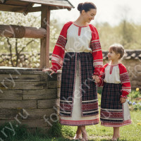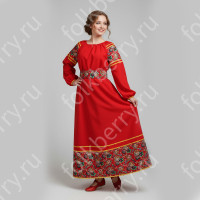 Изделие комбинированное, выполнено из ткани двух цветов – основной и дополнительной красной детали по низу рукава и рубахи.