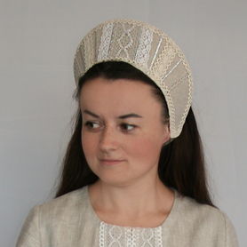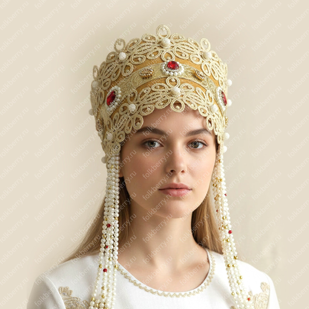 Для кокошника подобраны качественная парча благородного приглушенного золотого цвете, вологодское кружево, стеклянные, стразы рубинового цвета, бусины искусственного жемчуга.
