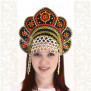Кокошник выполнен на твёрдой основе, ткань – атлас (креп сатин), декорирован вьюном, тесьмой «завиток», а так же бусами, пайетками, и бисером, которые пришиты вручную. Высота изделия составляет над головой 12,5 см, ширина 27 см. Сзади кокошник крепится резинкой и атласной лентой, которая завязывается в бант. Возможно корпоративные сочетания цветов и нанесение Вашего логотипа.