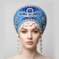 Кокошник выполнен на твёрдой основе, ткань – атлас (креп сатин), декорирован вьюном, тесьмой «завиток»,  а так же бусами, пайетками, и бисером, которые пришиты вручную. Высота изделия составляет над головой 12,5 см, ширина 27 см. Сзади кокошник крепится резинкой и атласной лентой, которая завязывается в бант. Возможно корпоративные сочетания цветов и нанесение Вашего логотипа.