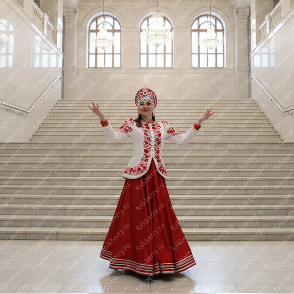 Костюм  выполнен из габардина и красиво подобранного декора в золотистых цветах. Достоинства габардина  в том, что он не мнется, не блестит, как атлас, ложится красивыми  мягкими складками, цвет не выгорает. Юбка  с оборкой, декор в золотистых цветах, по талии на  двойной резинке. Блуза  белого праздничного цвета, с баской,  рукава расширены внизу, с манжетами.   Сзади на блузе шнуровка. Она дает хорошую посадку по фигуре. Костюм предназначен для творческих  сольных и коллективных театральных выступлений.