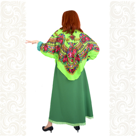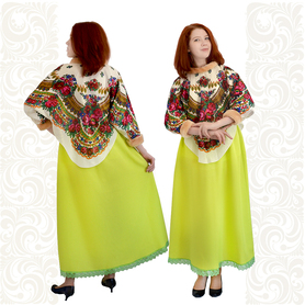 • Накидки, выполненной из яркой платочной ткани в цветах, отороченной искусственным мехом по горловине и на манжетах.