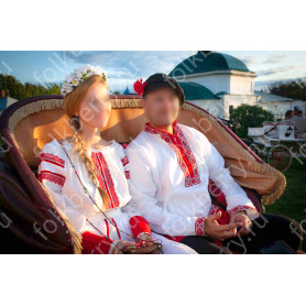 Костюм  выполнен из габардина и красиво подобранного декора в золотистых цветах. Достоинства габардина  в том, что он не мнется, не блестит, как атлас, ложится красивыми  мягкими складками, цвет не выгорает. Юбка  с оборкой, декор в золотистых цветах, по талии на  двойной резинке. Блуза  белого праздничного цвета, с баской,  рукава расширены внизу, с манжетами.   Сзади на блузе шнуровка. Она дает хорошую посадку по фигуре. Костюм предназначен для творческих  сольных и коллективных театральных выступлений.