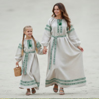 Платье  нежного красивого голубого цвета универсальное, т.к. хорошо садится по фигуре, благодаря регулируемой горловине, рукаву реглан, наличию длинного пояса.  Юбка (почти солнце) длиной немного ниже колена эффектно смотрится в танце. Талия слегка завышена. Декор платья - жаккардовая тесьма с обережными символами. Платье сшито из габардина, матовой, немнущейся ткани ярких цветов.