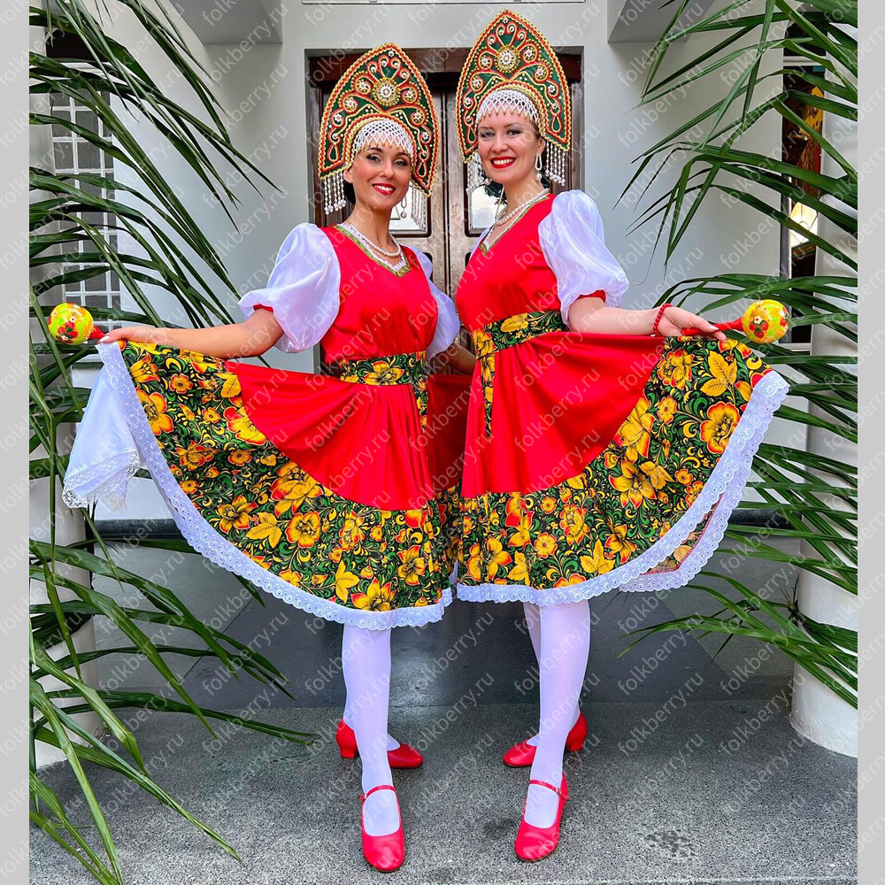 Платье сшито из яркого красного атласа и декорировано вставками с рисунком «хохлома». Юбка фасон полтора «солнца», подол и горловина украшены белым кружевом и тесьмой. Рукава «фонарики» сделаны из легкой, белой органзы.