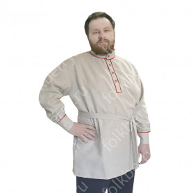 Косоворотка Казачья сшита изо небеленого льна светло-серого цвета, ткань плотная, мягкая. Втачной длинный рукав, манжеты с застежкой на пуговицу. Горловина, полочка и манжеты украшены кантом красного цвета. Кант - скромное и стильное украшение этой добротной косоворотки. К косоворотке прилагается пояс. Косоворотка понравится тем, кто хочет носить одежду этого стиля, кто участвует в реконструкциях, при создании образа в театрализованных спектаклях, на фотосессиях, семейных, православных мероприятиях и др.