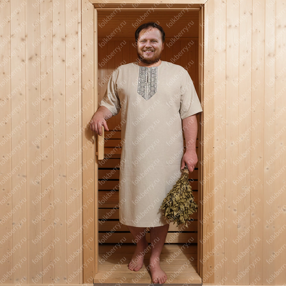 Рубаха мужская "Банька" предназначена для банщиков, массажистов и любителей бани и сауны. Сшита из мягкого комфортного льна светло-серого цвета,  ткань натуральная, не окрашенная красками, дышащая, не колючая.