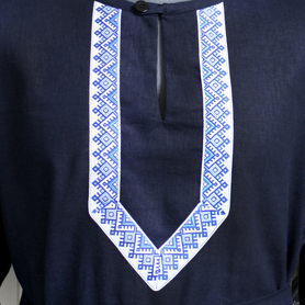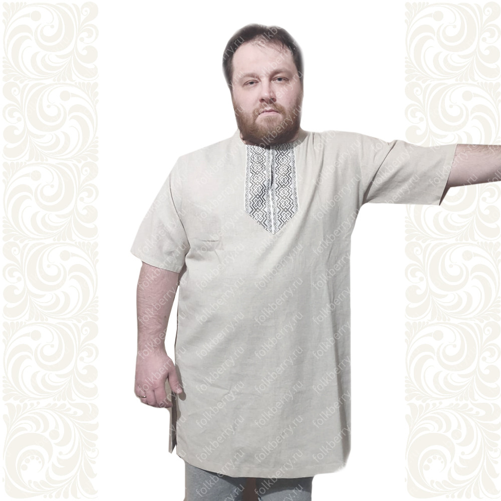 Фасон рубахи удобен и не ограничивает движения. Жесткий воротник, пуговицы отсутствуют, рукав втачной, немного спущенный, свободный, длина рукава примерно до локтя. По бокам внизу разрезы. К рубахе прилагается пояс. Декор на груди выполнен из жаккардовой тесьмы в натуральном цвете. Для подбора правильного размера, в заказе, пожалуйста, пишите рост, обхват груди и талии.