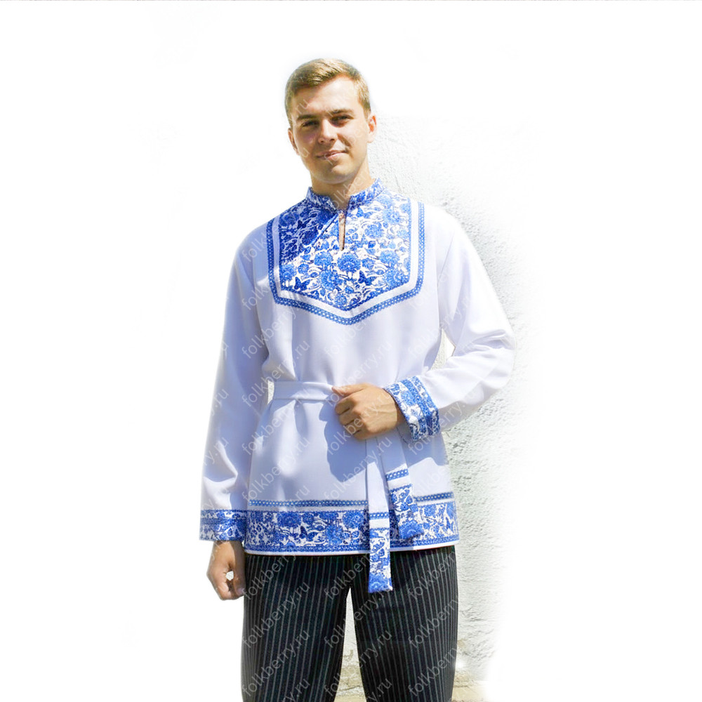 Рубаха "Василёк" выполнена из габардина белого оптического цвета. Декором косоворотки стали большие по размеру вставки из хлопка с цветочным рисунком в сине-голубом цвете и вьюн синего цвета. С Косоворотка без воротника-стойки удобна при надевании на верхнюю одежду (на зимних мероприятиях). Косоворотка "Василек" и сарафан с блузой "Гжель" подойдут для участников одного ансамбля.