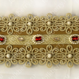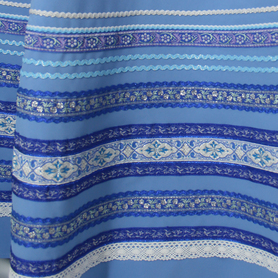 Длинный яркий сарафан, сшитый из габардина, украшают жаккардовая тесьма и тесьма «вьюнок», которые эффектно сочетаются с цветом ткани. Такая же тесьма украшает белую хлопковую блузу с пышными рукавами, что придает ей эффектный праздничный вид.