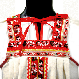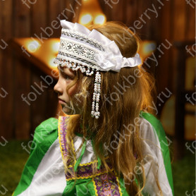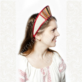 Дополнив костюм «Народный» головным убором в русском стиле (очелье, кокошник или сорока), надев на шею красные, яркие бусы можно сделать образ более завершенным.