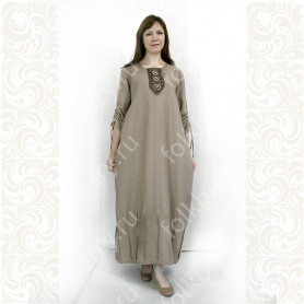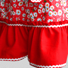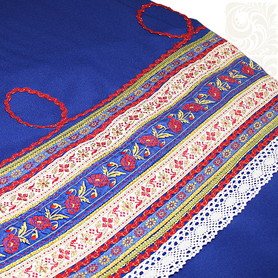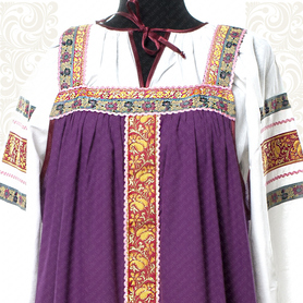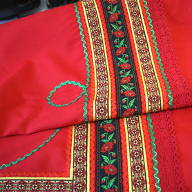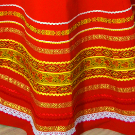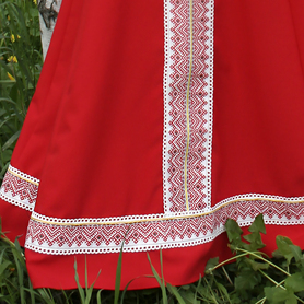 Сарафан длинный, сшит из яркого габардина, украшен тесьмой жаккард и «вьюнок», которая эффектно сочетается с цветом ткани.