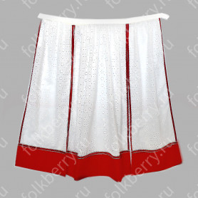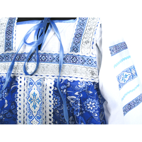 Белая блуза с пышными рукавами из хлопка украшена такой же тесьмой, что и сарафан. Это делает её красивой и праздничной.