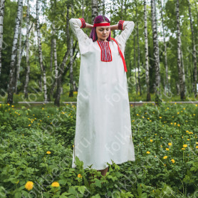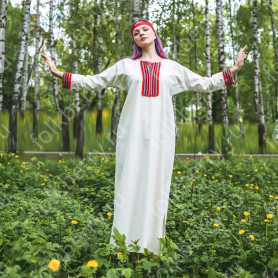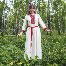 Традиционный длинный сарафан Веста - прекрасный вариант для тех, кто в повседневной жизни носит вещи в русском стиле и для тех, кто надевает подобные вещи по праздникам. Добротный. Комфортный. Красивый. Сарафан выполнен из плотного мягкого небеленого льна молочного цвета, украшен жаккардовой тесьмой в красно-золотистом цвете. Блуза выполнена из хлопка белого цвета, со вставками на рукавах изо льна. Украшена такой же жаккардовой тесьмой, что и сарафан. Длина бретелей регулируется.