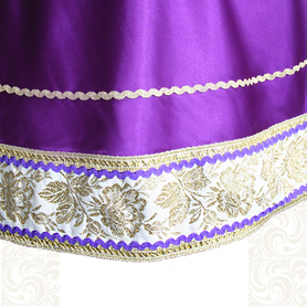 Юбка-понева состоит из трех прямоугольников, собранных на общем поясе или шнуре. Юбка красиво украшена декоративной тесьмой, тщательно подобранной дизайнером (с рисунком Маки, вьюнками разного цвета, бархатной тесьмой)